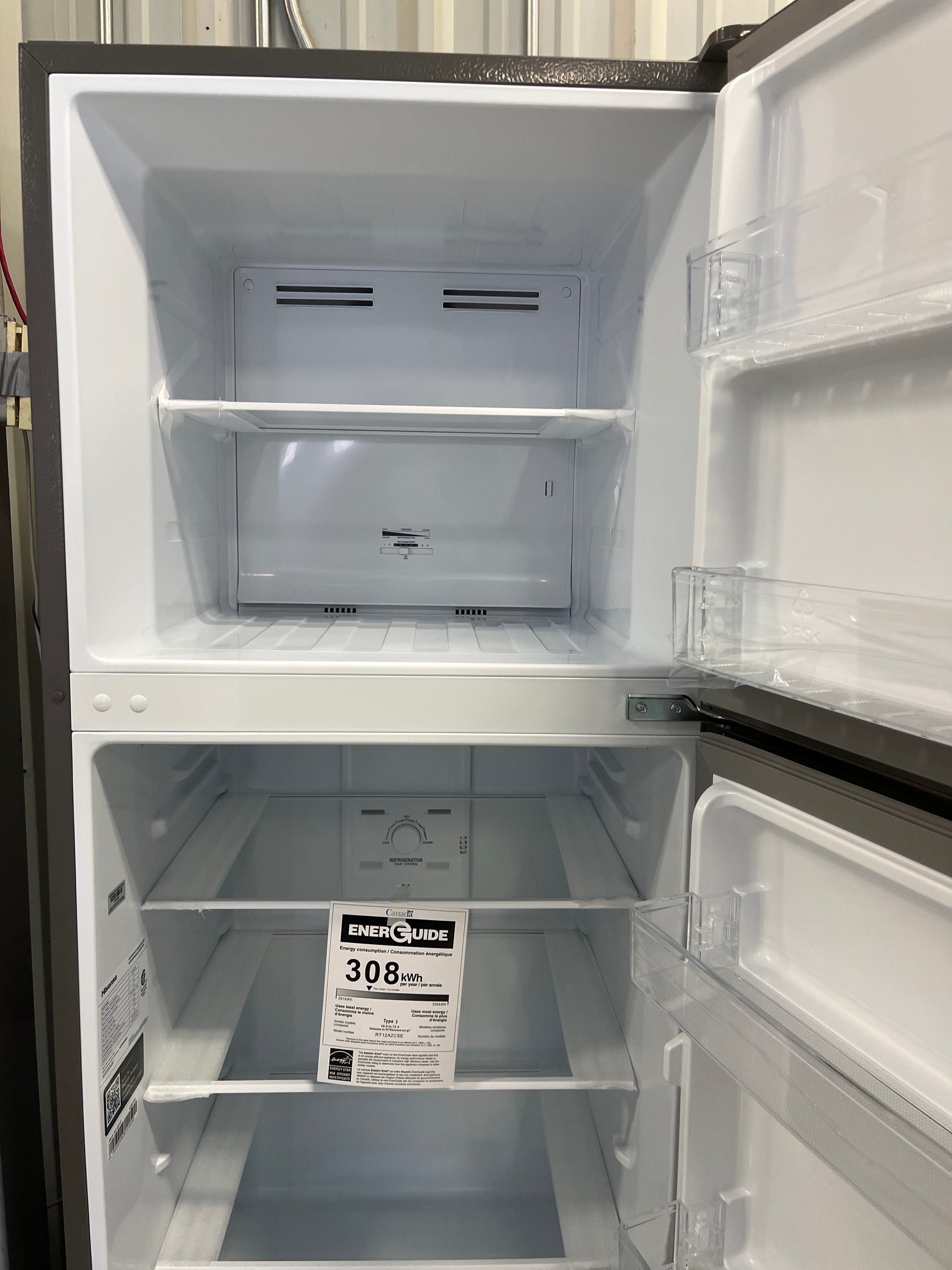 Brand: Hisense Model: RT12A2CSE Condition: Open Box The Hisense RT12A2CSE is a compact top freezer refrigerator designed for efficiency and style. Featuring a sleek stainless steel finish, this model offers practical storage solutions and user-friendly features, making it an ideal choice for kitchens, apartments, or offices. Key Features: - Adjustable glass shelves for flexible storage options - LED interior lighting for clear visibility - Reversible door for easy placement in any space - Frost-free operation to reduce maintenance - Full-width crisper drawer to keep produce fresh - Quick-cool functionality for rapid temperature adjustment Specifications: - Total Capacity: 12 cu. ft. - Freezer Capacity: 3.1 cu. ft. - Refrigerator Capacity: 8.9 cu. ft. - Energy Star Certified: Yes - Defrost Type: Frost Free Width: 24 Depth: 25 Height: 67 Colour: Stainless Steel