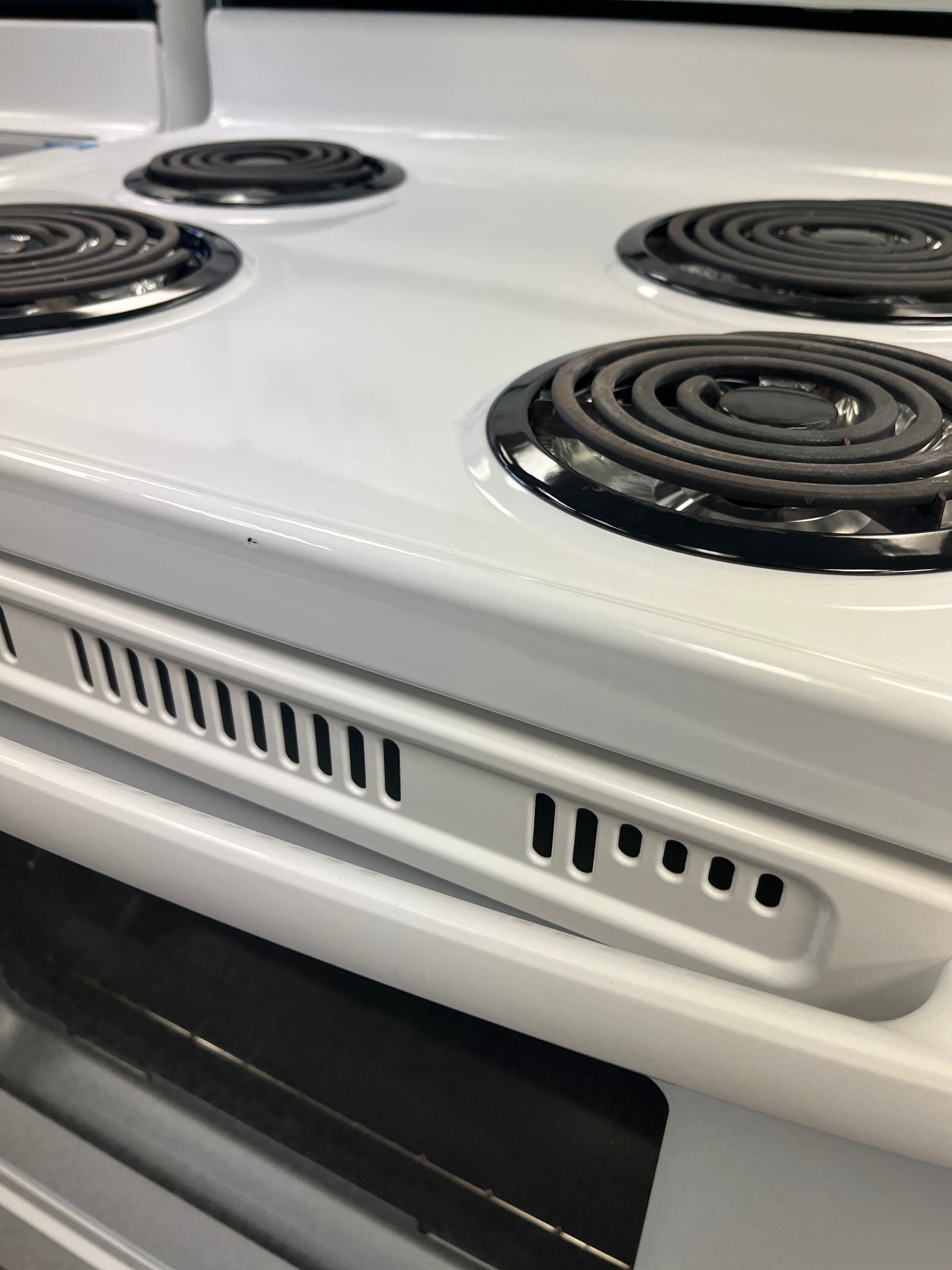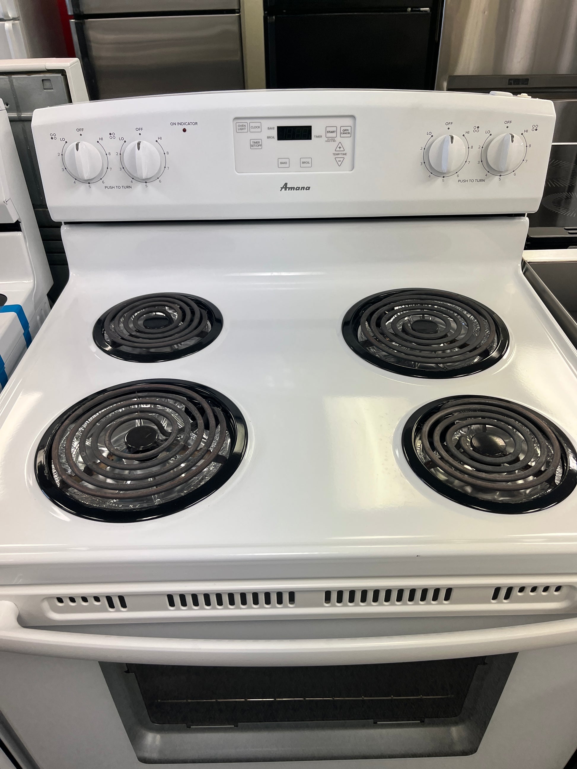 Brand: Amana Model: YACR4330BCW Condition: Refurbished The Amana YACR4330BCW is a dependable 30-inch electric range designed to deliver reliable cooking performance for busy kitchens. This refurbished model features an easy-to-clean cooktop and multiple oven functions to suit your daily cooking needs. With a classic white finish, it fits seamlessly into a variety of kitchen styles. Key Features: - Four coil elements provide versatile cooking options - Easy-to-clean porcelain spill saver upswept cooktop - Large-capacity oven with multiple baking and broiling settings - Oven window and interior light for convenient viewing - Adjustable rack positions to accommodate different sized dishes - Temperature management system for consistent, even cooking Specifications: - Oven Capacity: 4.8 cu. ft. - Number of Burners: 4 - Fuel Type: Electric - Bake element power: 2400 Watts - Broil element power: 3400 Watts - Control Type: Knobs Width: 30 Depth: 28 Height: 47 Colour: White