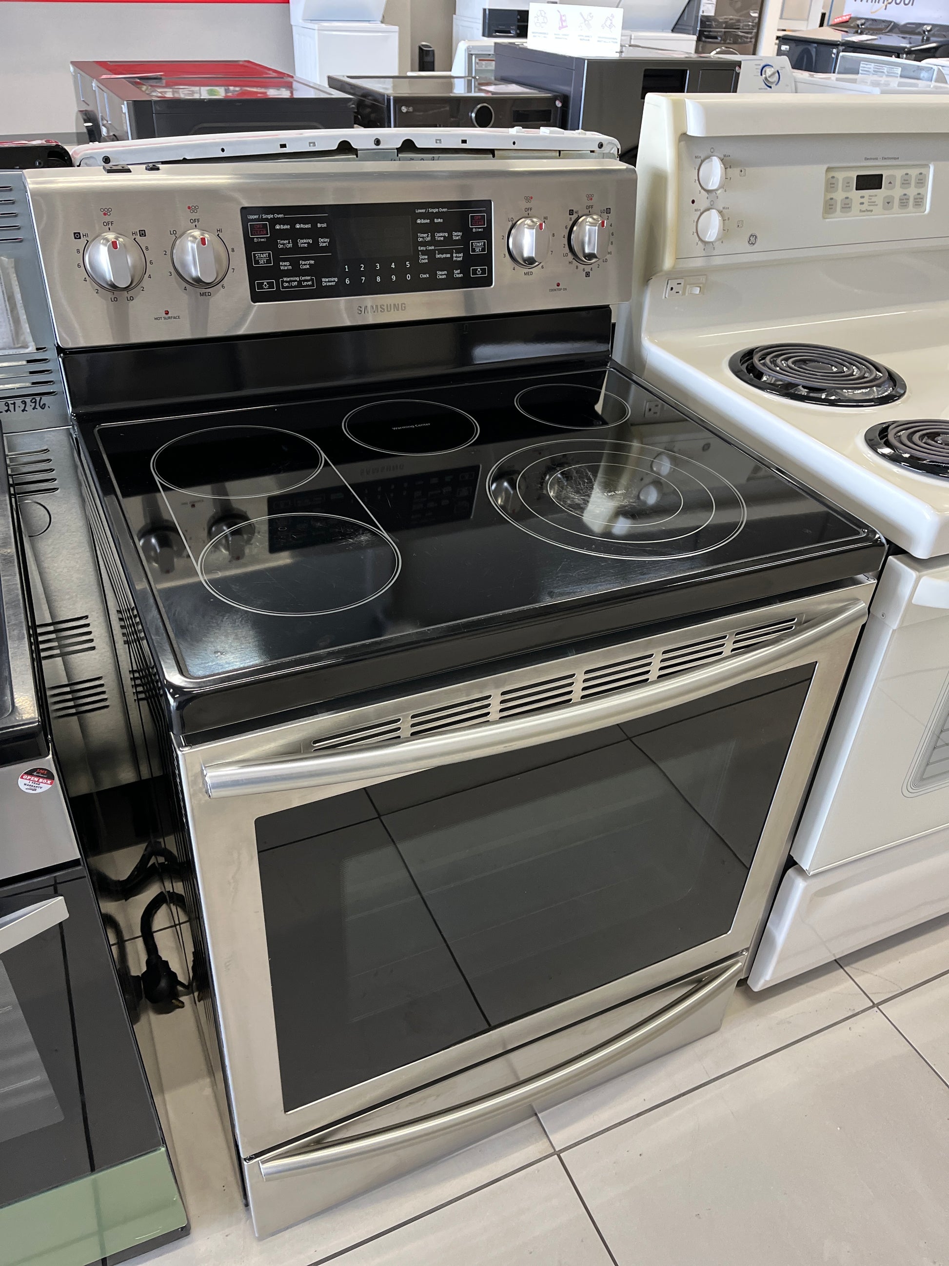 Brand: Samsung Model: NE59J7750WS Condition: Refurbished The Samsung NE59J7750WS is a versatile 30-inch electric range designed for both style and performance. This stainless steel model features a spacious oven, advanced cooking technology, and is ideal for households seeking reliable and modern kitchen appliances. Key Features: - Dual Convection: Ensures even cooking and faster baking times - Flex Duo Oven: Splits into two separate ovens for unmatched meal flexibility - Five Cooktop Elements: Accommodates multiple pots and pans at once - Steam Clean: Makes maintaining the oven easy and convenient - Guiding Light Controls: Simple, intuitive touch controls for precision - Warming Drawer: Keeps dishes hot and ready to serve - Large Oven Capacity: Perfect for large family meals and holiday gatherings Specifications: - Oven Capacity: 5.9 cu. ft. - Cooktop Type: Smoothtop Electric - Number of Burners: 5 Width: 30 Depth: 26 Height: 47 Colour: Stainless Steel